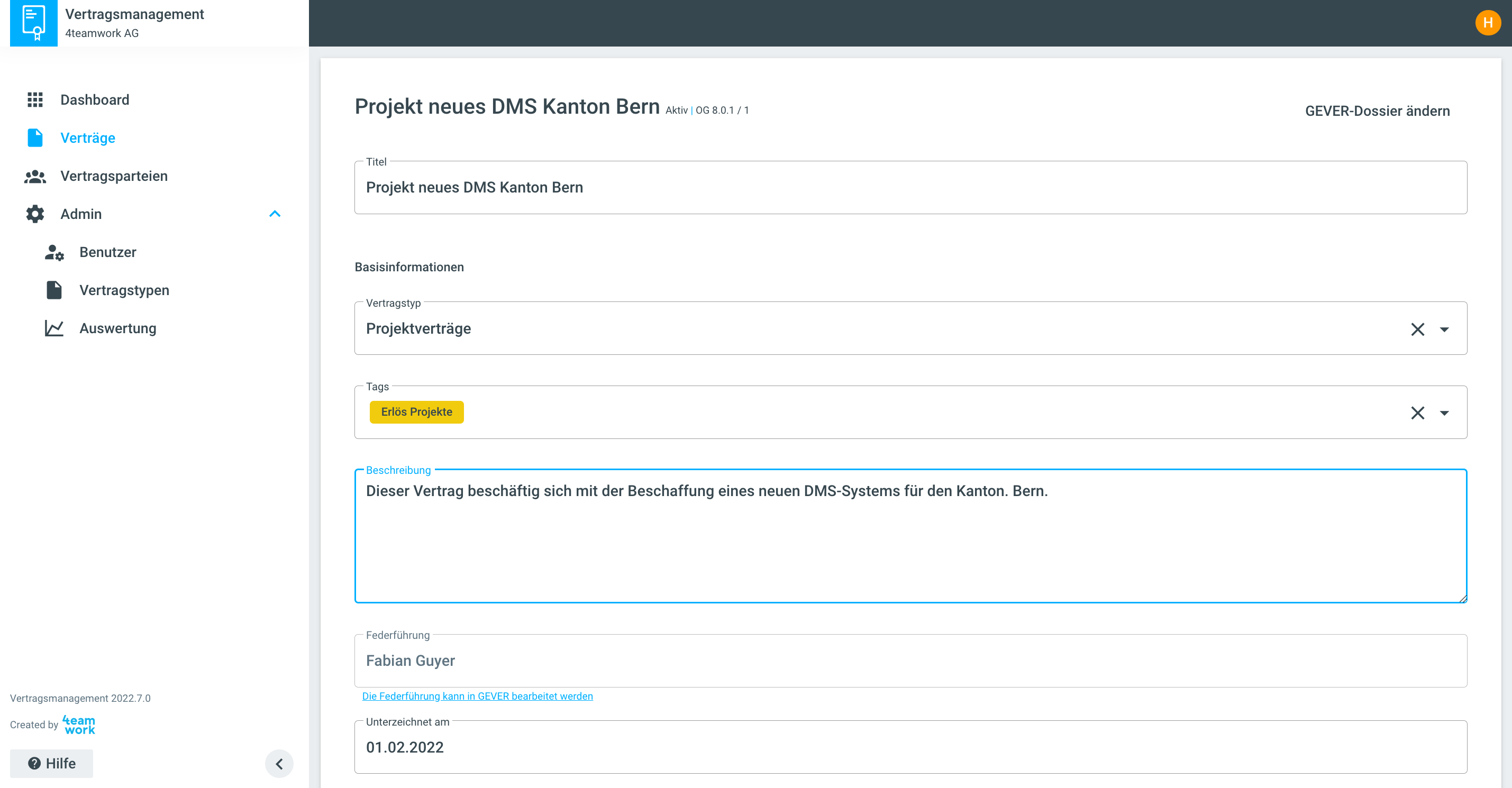 | Die Federführung zeigt die Verantwortliche Person für den Vertrag an. Diese kann nur in GEVER angepasst werden. |