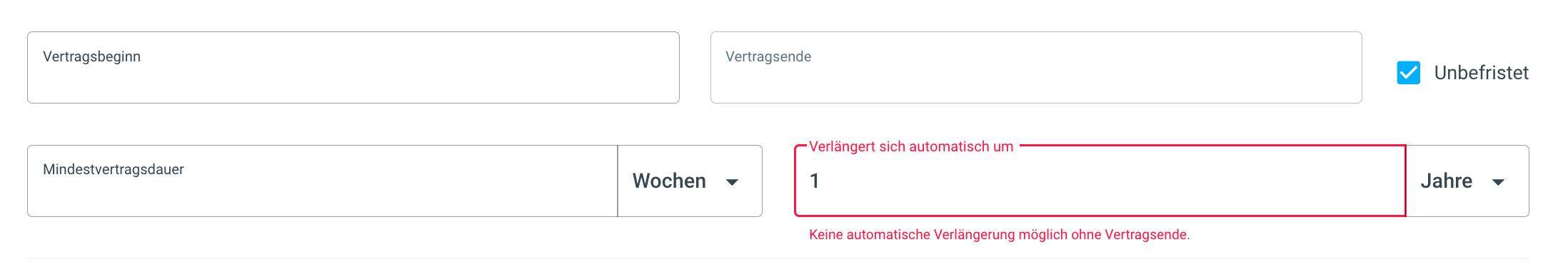 | Die Mindestvertragsdauer des Vertrags kann in den Einheiten Wochen, Monate oder Jahre festgehalten werden. |