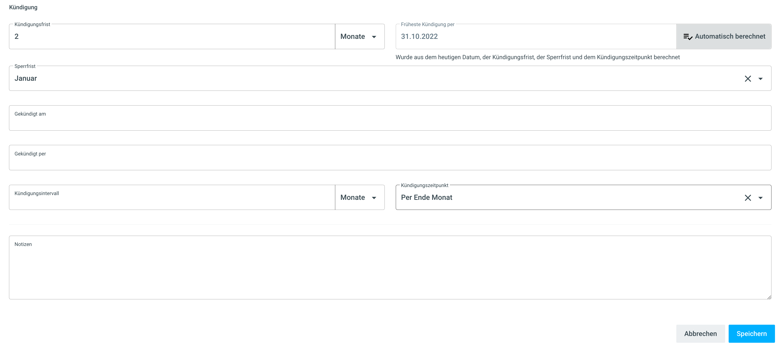 Der Vertrag kann also frühestens auf dieses Datum gekündet werden. Das Feld wird standardmässig automatisch nach folgender Logik berechnet:
