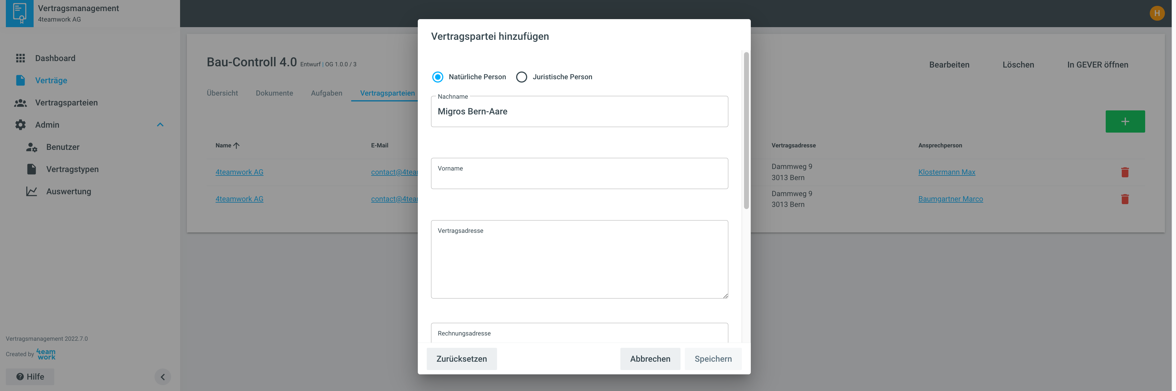 Mit einem Klick auf die Vertragspartei kann die Firmenname, Vertragsadresse, Rechnungsadresse, Anschrift, Mail und Telefonnummer mutiert werden.