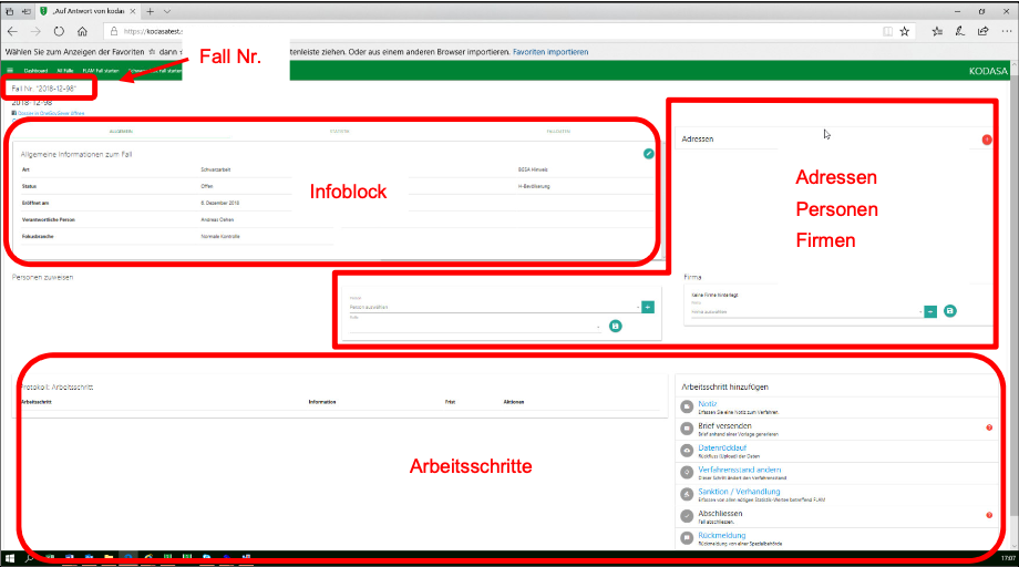 Über die verschiedenen Felder können Datensätze direkt im Fall erfasst, geändert und dem Fall zugewiesen werden. Die eingegebenen Daten werden im Hintergrund in den jeweiligen Datenbanken gespeichert.