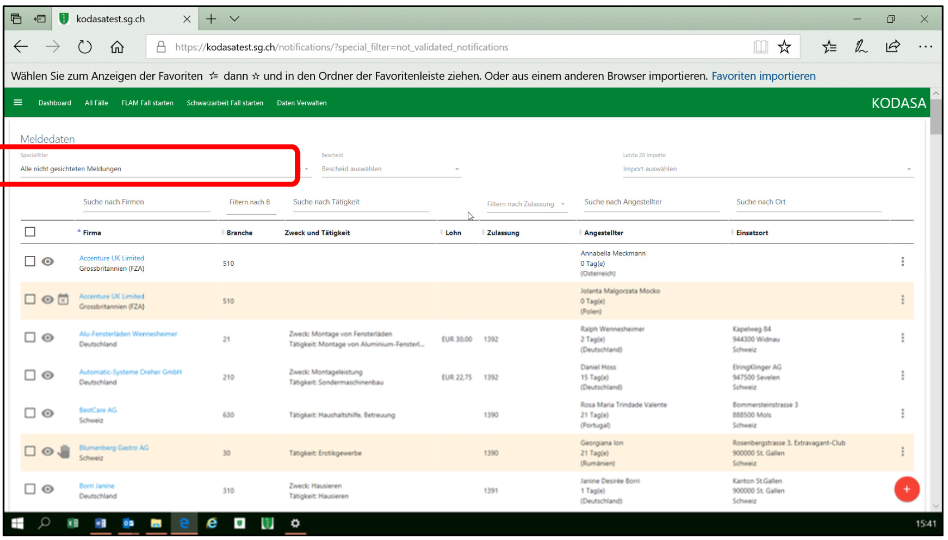Es wird die “Meldedatenbank” mit dem voreingestellten Filter alle nicht gesichteten Meldungen geöffnet. Mit diesem Filter wird gewährleistet, dass schlussendlich alle Meldedaten gesichtet werden.