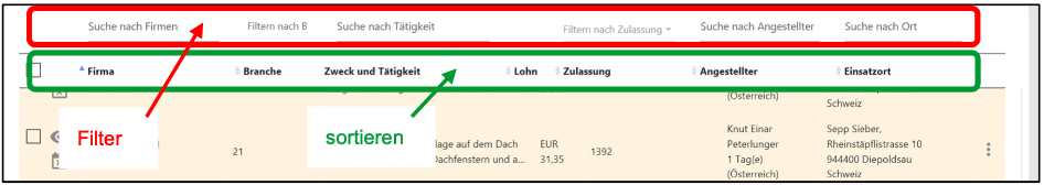 Die Meldungen können über den Suchbereich nach diversen Feldern gefiltert werden. Die einzelnen Spalten können auf- und absteigend sortiert werden.