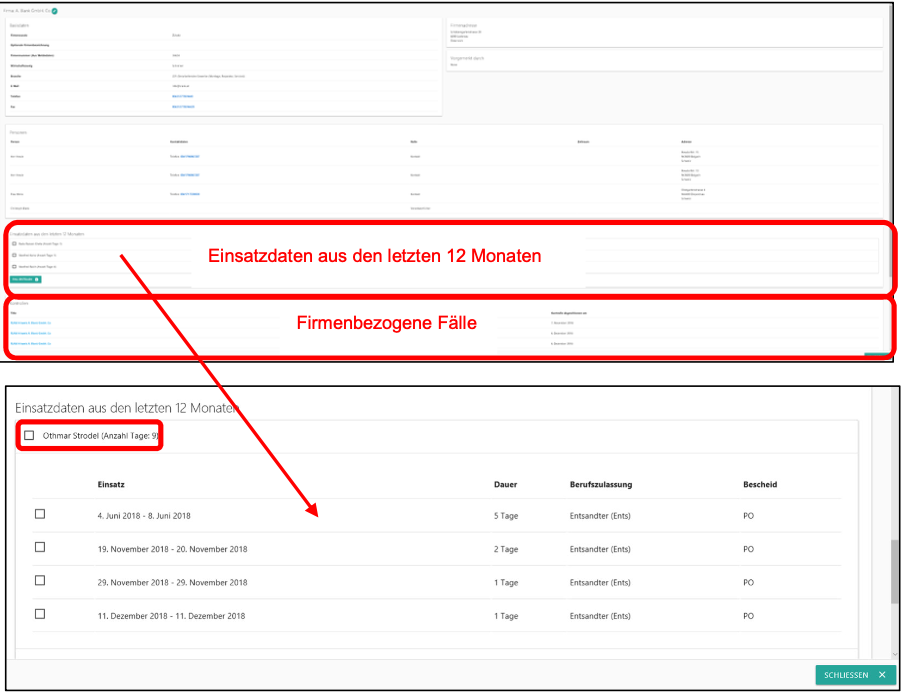 Einsatzdaten aus den letzten 12 MonatenHier werden sämtliche Meldedaten (Personen, Anzahl Einsatztage und Einsatzdaten) aus den letzten 12 Monaten aufgelistet. Durch auswählen der Person werden die Einsatzdaten und weitere Informationen aufgelistet.