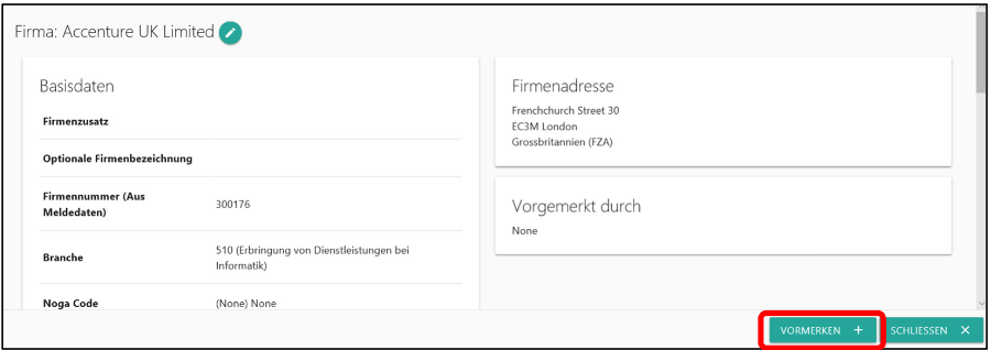 Firma Übersichtwird dieVormerkungüber die Schaltfläche :vormerken: gesetzt.