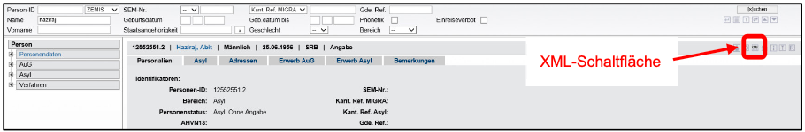Die benötigte Person wird in einem ersten Schritt im Zemis gesucht und ausgewählt. Anschliessend werden die Personendaten über die Schaltfläche:xml:auf den PC herunter geladen und gespeichert.