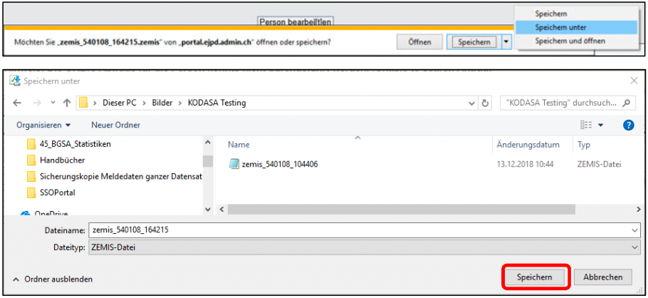 Am unteren Bildschirmrand poppt eine Meldung auf. Über Pfeil bei der Schaltfläche Speichern den Eintrag Speichern unter auswählen und Datensatz an einem selbst gewählten Speicherort speichern.
