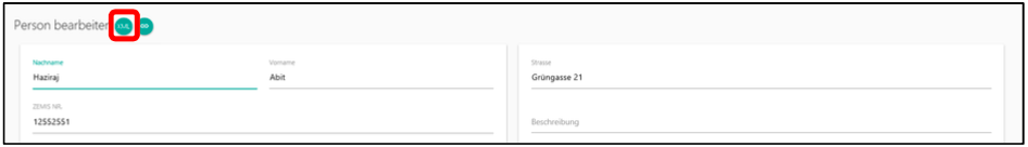 Diese Funktion steht in der Maske Person bearbeiten zur Verfügung. Als Grundlage steht ein bereits erfasster Personendatensatz mit Zemisnummer. Dieser kann durch aktualisierte Daten aus dem Zemis ergänzt / aktualisiert werden.