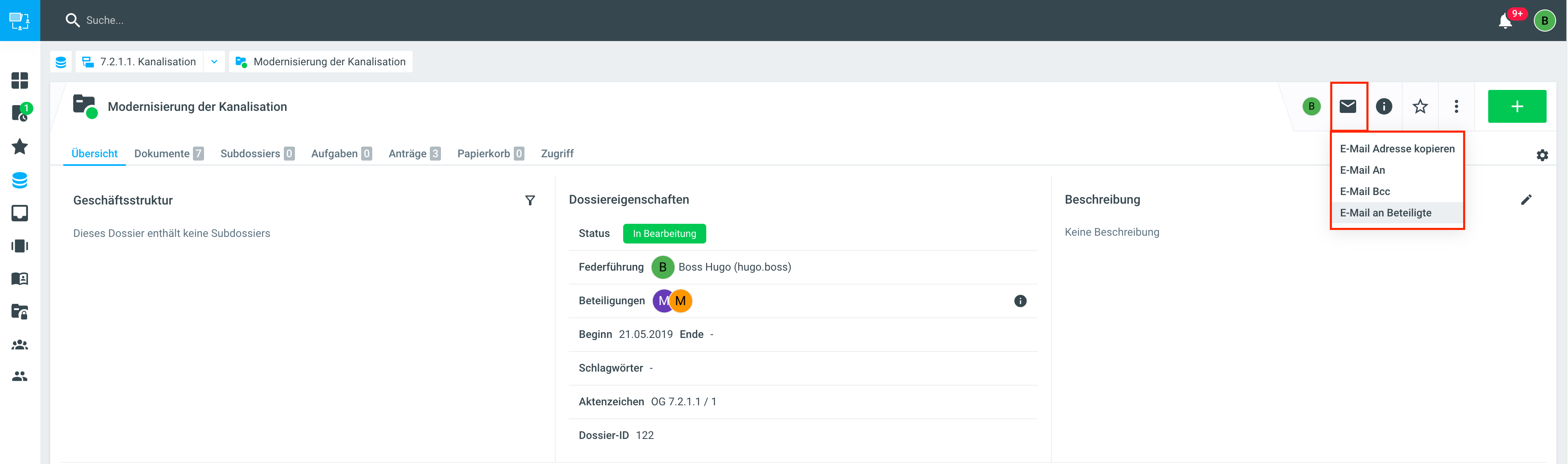 Les personnes impliquées dans un dossier peuvent être contactées en appuyant sur un bouton. L'adresse e-mail définie par défaut pour le contact est alors utilisée.
