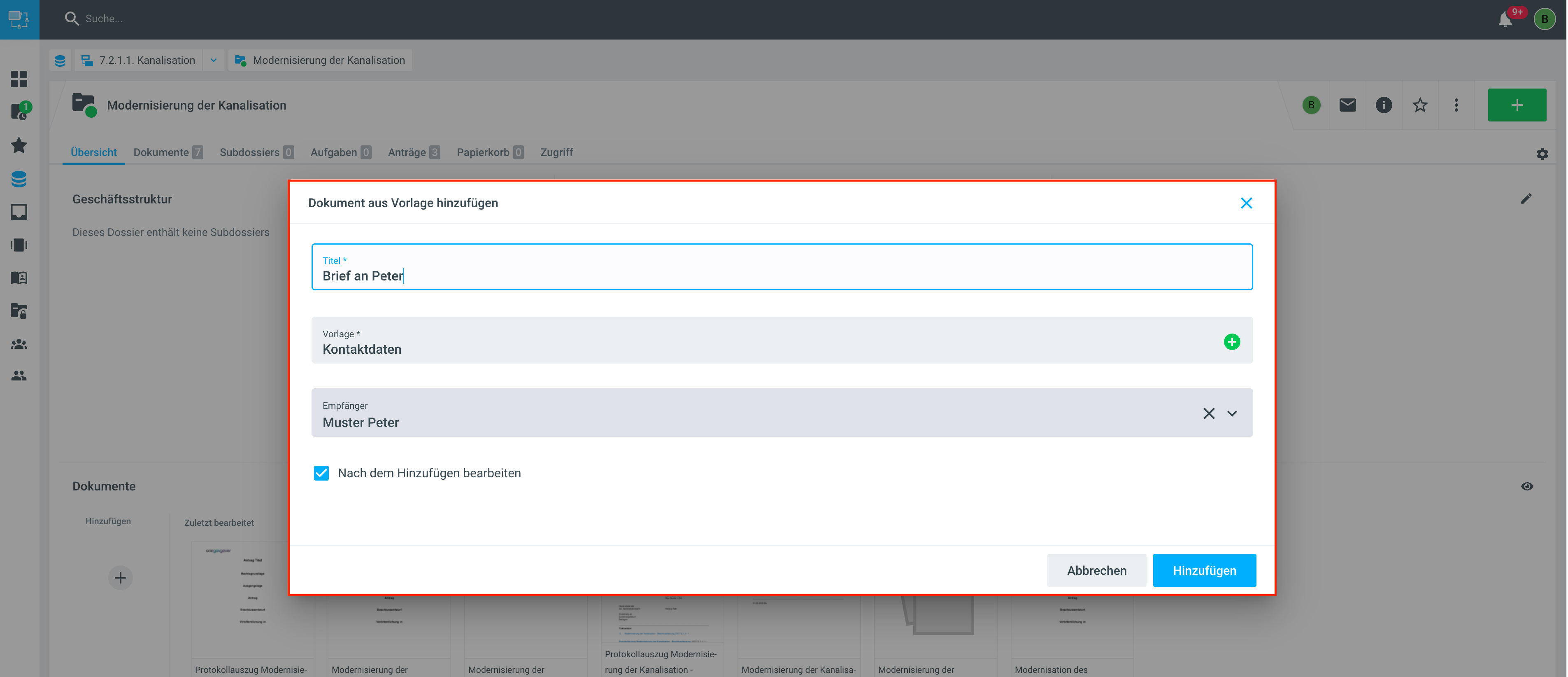 Avec la fonctionnalité Document à partir d'un modèle dans la GED (GEVER), il est également possible d'utiliser des contacts, des organisations ou des appartenances. Pour utiliser cette fonctionnalité, il faut créer au préalable un modèle correspondant avec les DocProperties disponibles. De cette manière, les métadonnées des contacts peuvent être utilisées et remplies pour les modèles GED (GEVER).