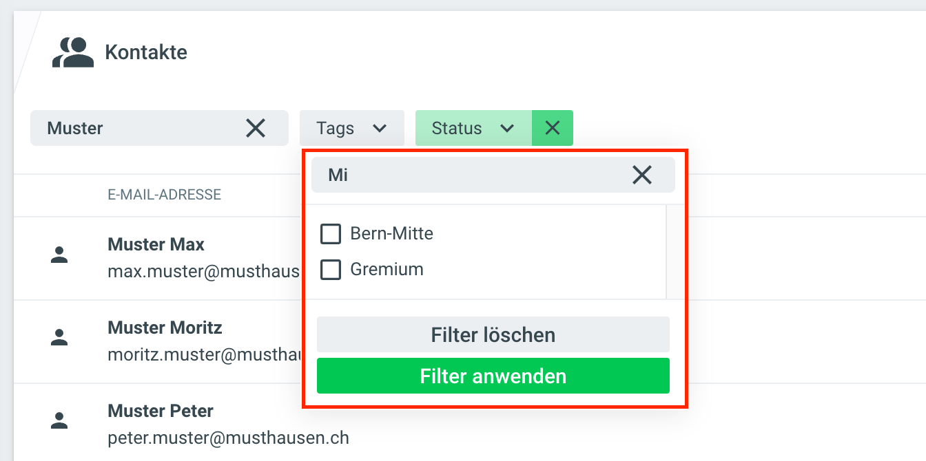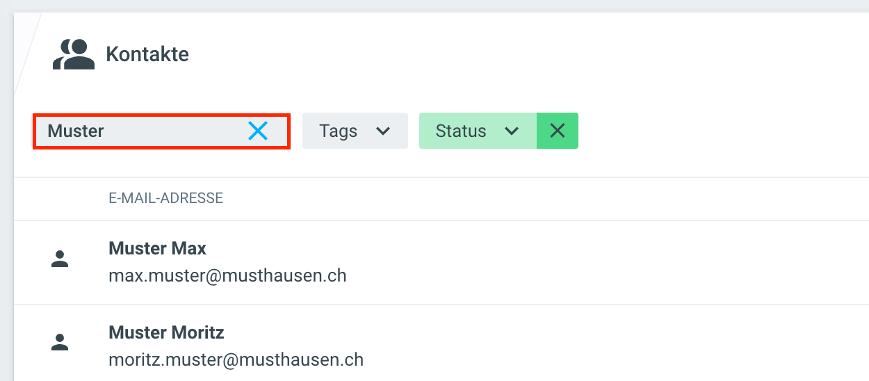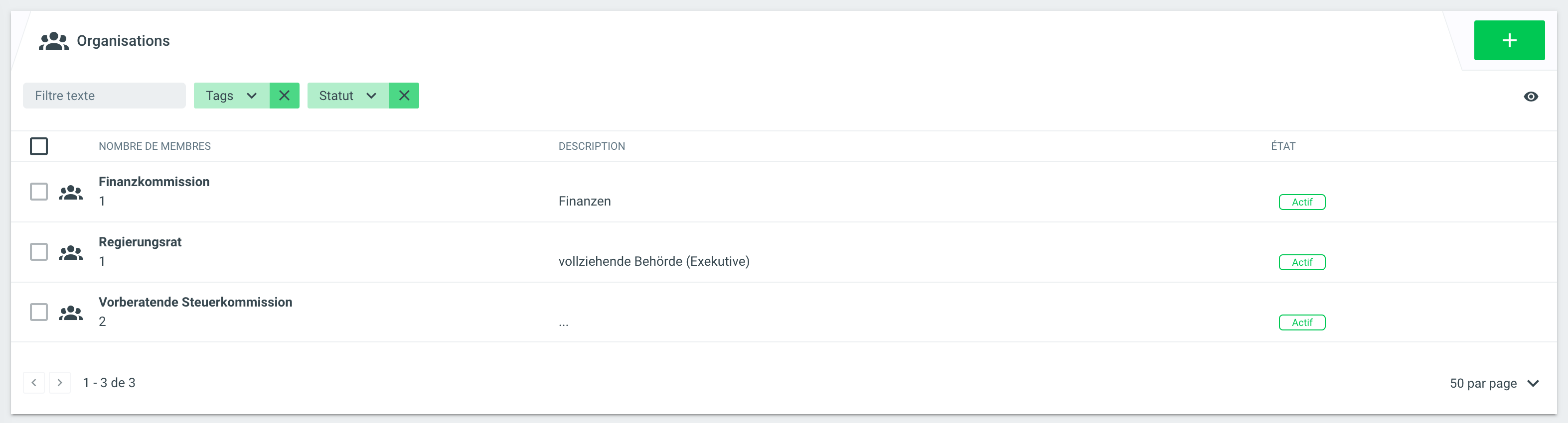Les tags sont disponibles globalement et peuvent être utilisés aussi bien pour les contacts que pour les organisations. Les tags peuvent également être supprimés. Il convient de noter que les tags sont supprimés du système dès qu'ils ne sont plus associés à un contact ou à une organisation.