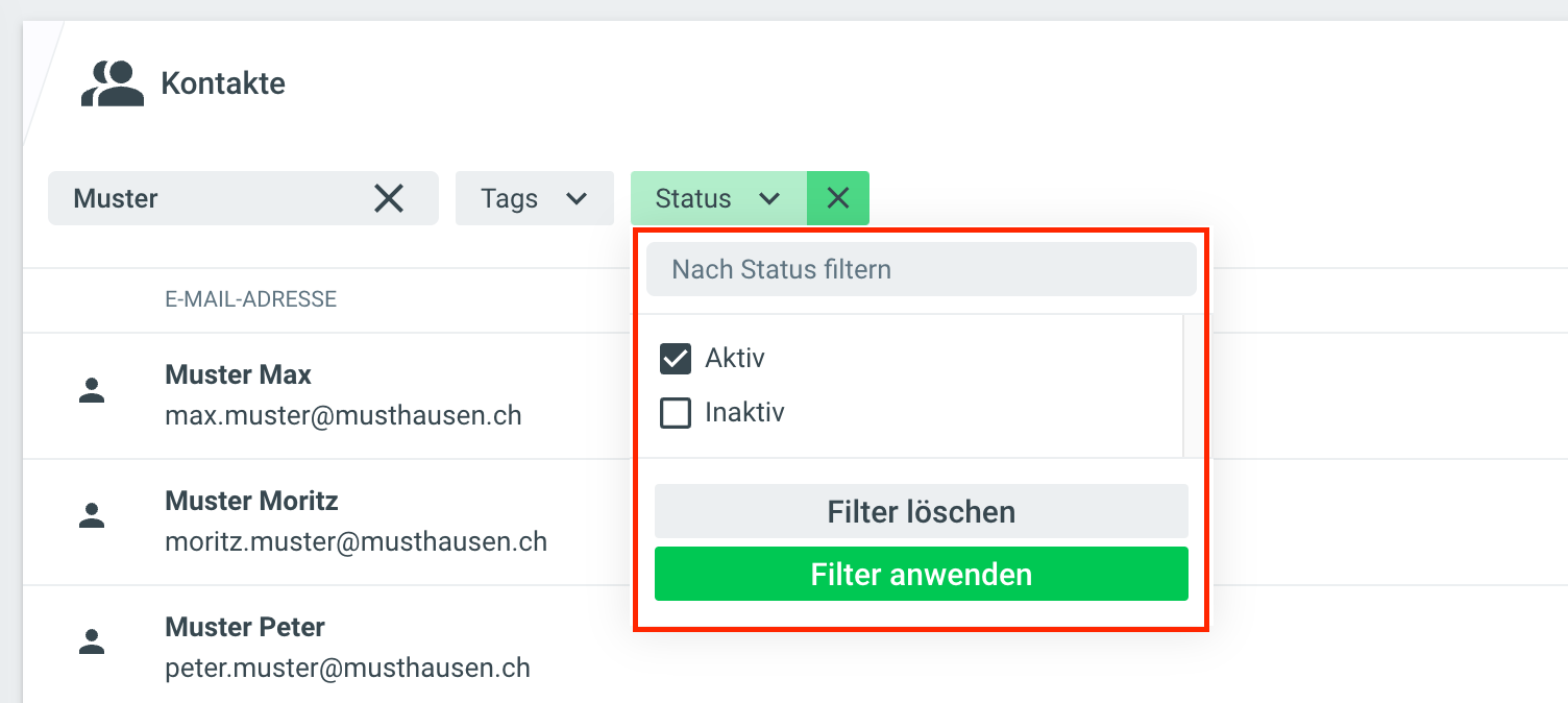 | Le filtre de statut permet de limiter les résultats de la recherche aux contacts / organisations actifs ou inactifs. ![]() |