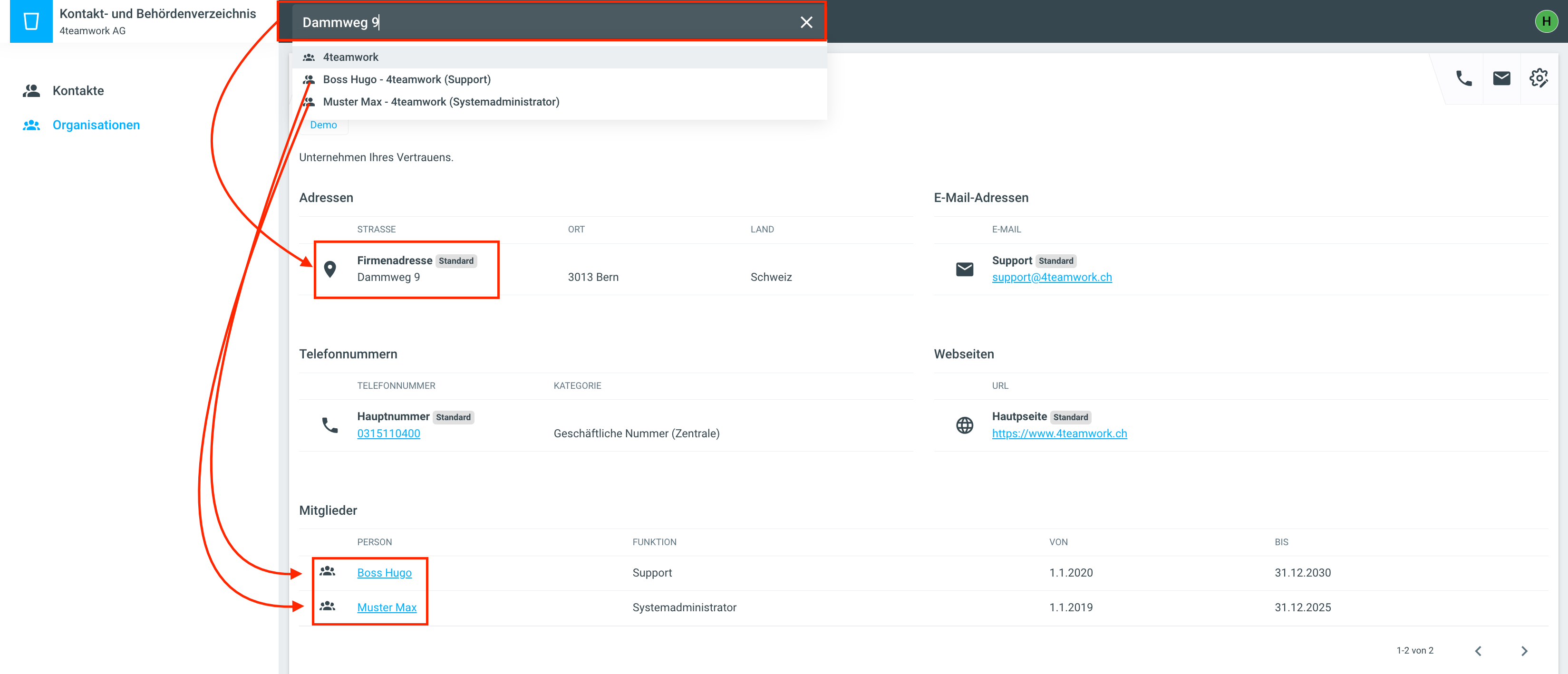 Si l'on recherche par exemple Dammweg 9, comme dans l'exemple ci-dessous, tous les objets contenant le terme recherché sont listés. Les membres dont l'organisation contient l'adresse saisie sont également listés.
