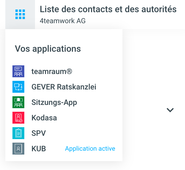 À gauche se trouvent l'App Switcher et le menu de navigation. L'App-Switcher liste toutes les applications liées au portail. Il suffit d'appuyer sur un bouton pour passer à l'application correspondante. Dans la partie inférieure de la page se trouve en outre l'aide, qui mène à la documentation utilisateur.