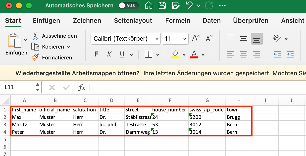 Der XLSX-Export ist für die Erstellung von Serienbriefen gedacht. Im Export enthalten sind alle Attribute die für die Postanschrift eines Kontaktes benötigt werden.