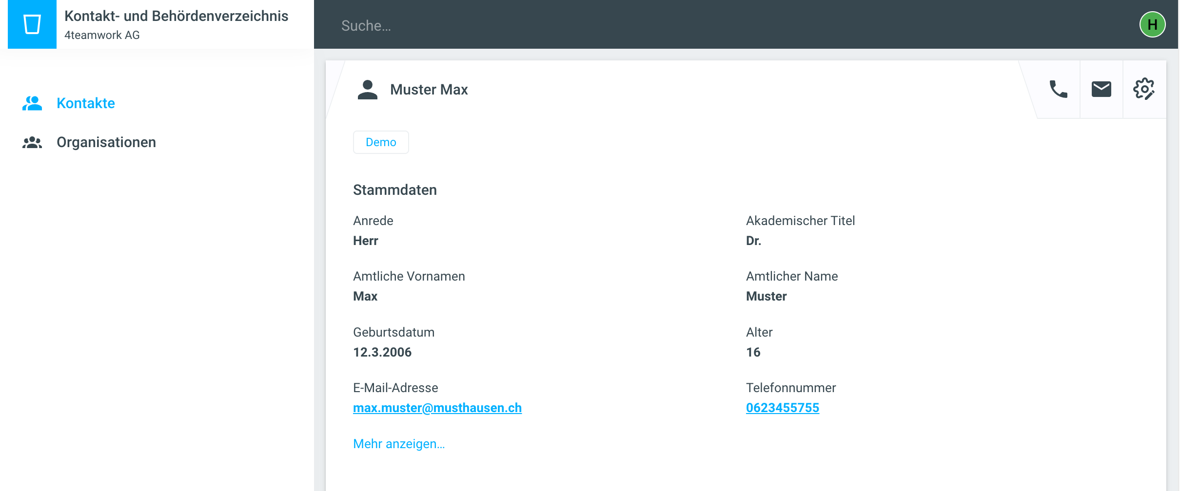 Über die Short-Actions oben rechts können die Schnellaktionen Anrufen und Mail ausgewählt werden. Zudem kann der Kontakt über das Zahnrad mit dem Bleistift bearbeitet werden.