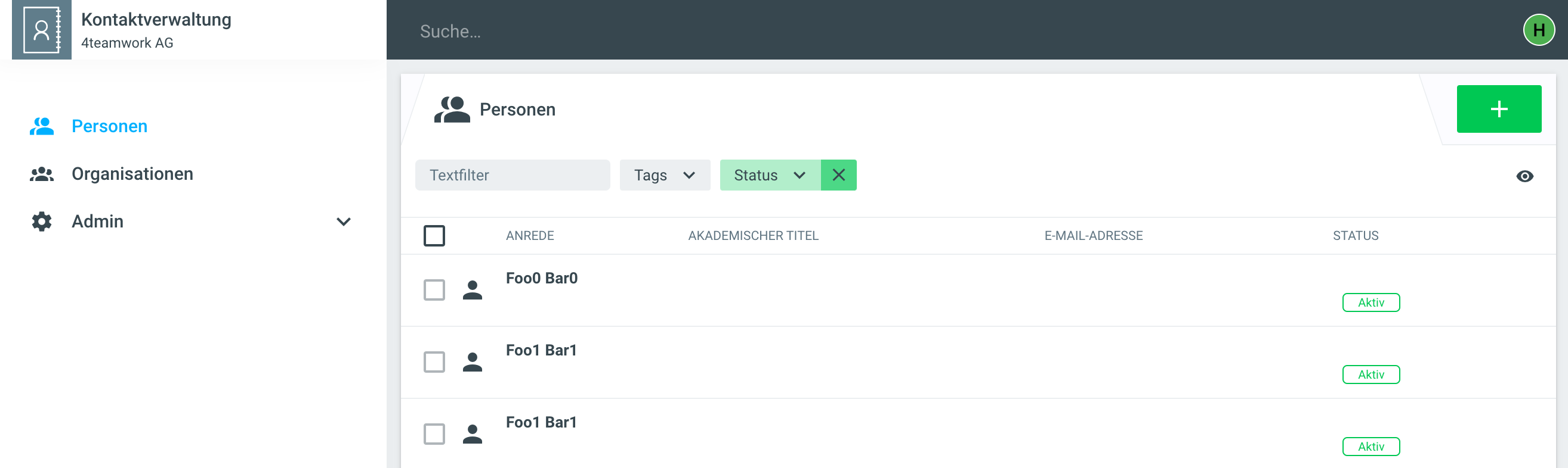 Die Seite Kontakte listet alle erfassten Kontakte auf. Standardmässig werden nur aktive Kontakte dargestellt. In der Auflistungsansicht können Kontakte: