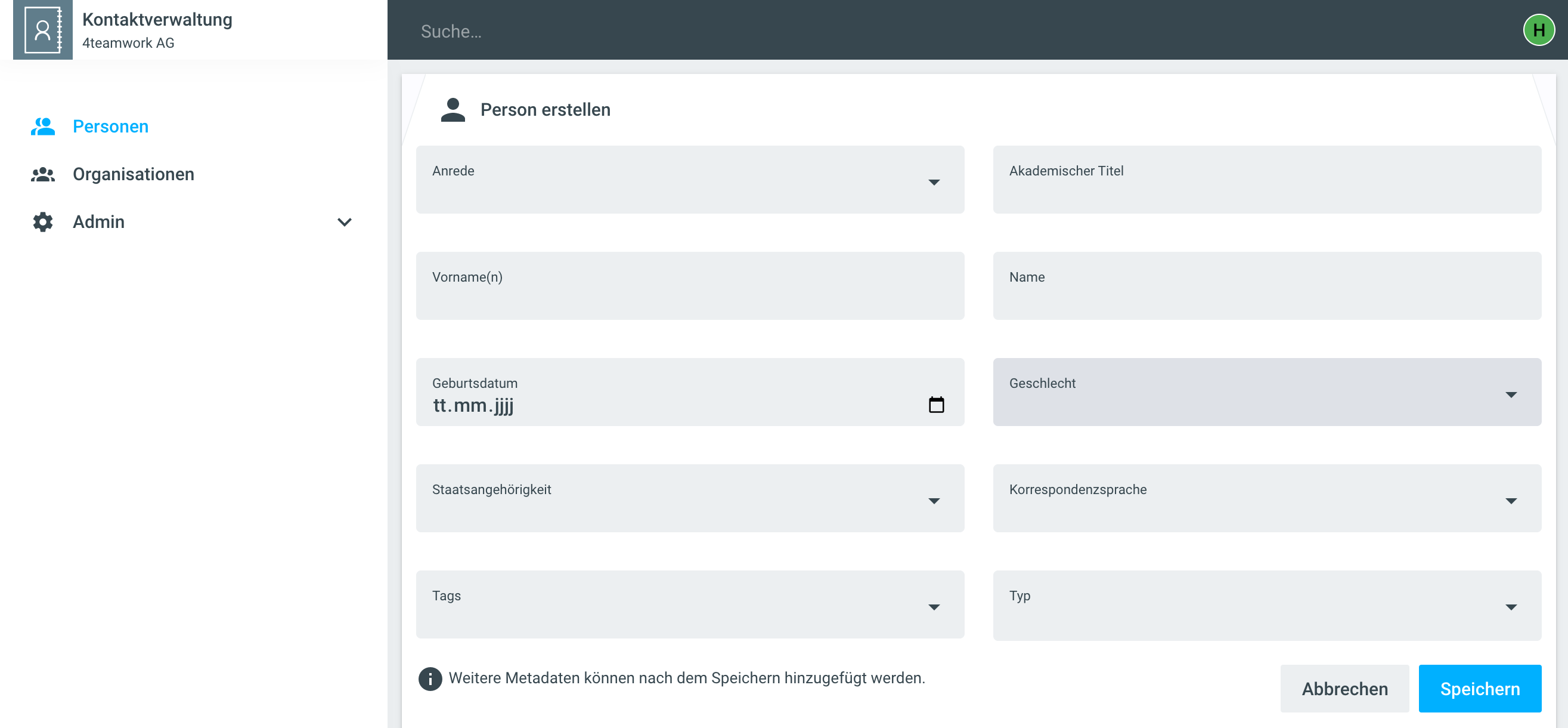 In der Hinzufügen-Masken können die Metadaten eingegeben werden. Dabei gilt es zu beachten, dass allen zusätzliche Kontaktdaten mehrfach hinzugefügt werden können.