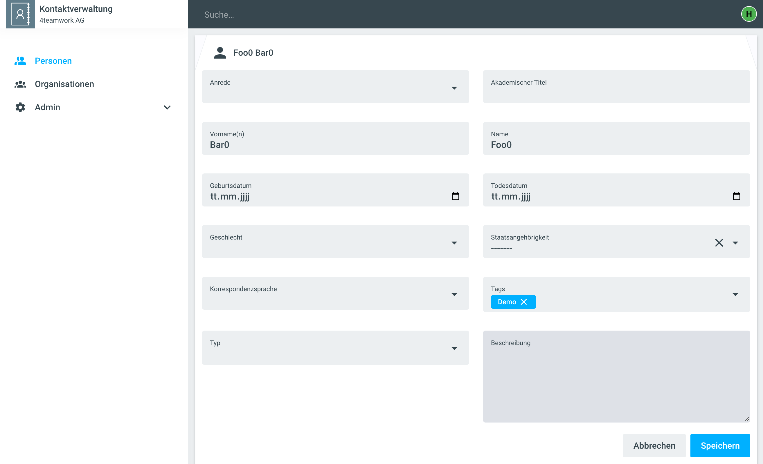Die Bearbeitungsmaske ist wiederum in zwei Bereiche aufgeteilt. Im oberen Bereich können die Stammdaten bearbeitet und im unteren die zusätzliche Kontaktdaten erfasst werden. Änderungen an einem Kontakt können entweder durch die Aktion Speichern übernommen oder durch die Aktion Abbrechen verworfen werden.