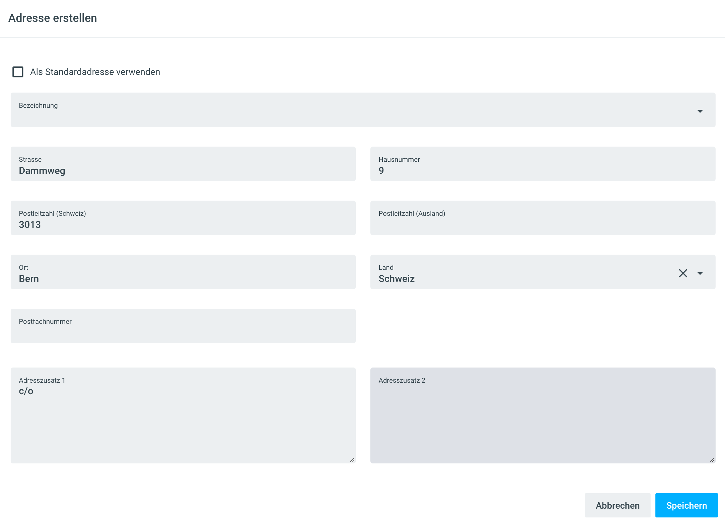 | Die Bezeichnung dient der Typisierung des Datensatzes. Unterscheidet sich z.B bei einem Kontakt die Postadresse von der Rechnungsadresse, kann dies hier hinterlegt werden. Die Auswahl wird mit Absicht nicht auf eine fixe Liste von Auswahlwerten eingegrenzt, damit die Erfassung so flexibel wie möglich bleibt. |