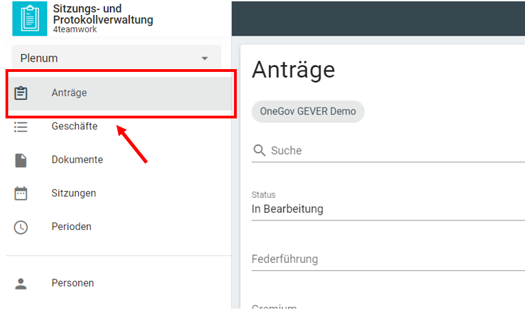 Nun wechseln wir vom Antragswesen ins Sitzungsmanagement. Eingereichte Anträge werden unter «Anträge» aufgelistet.