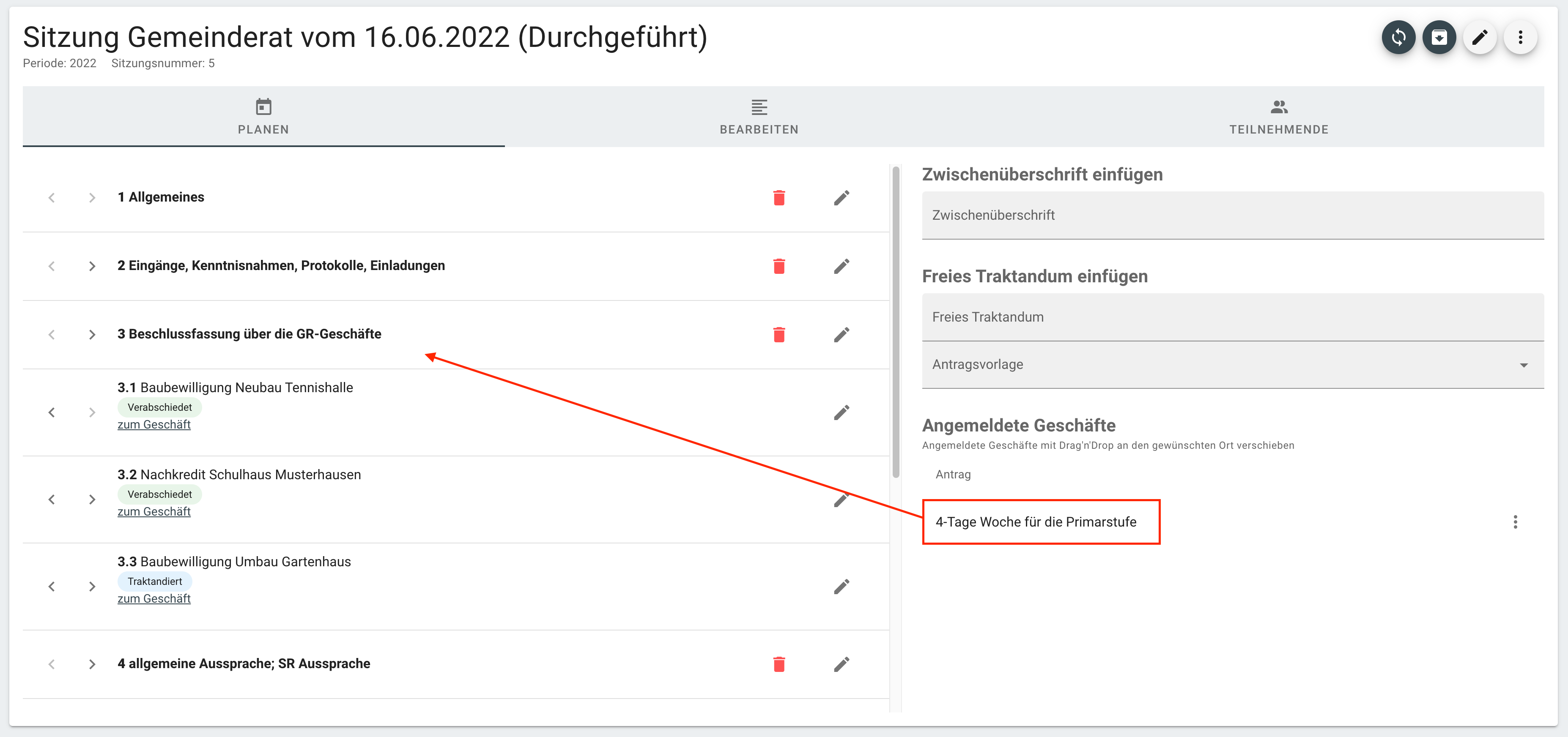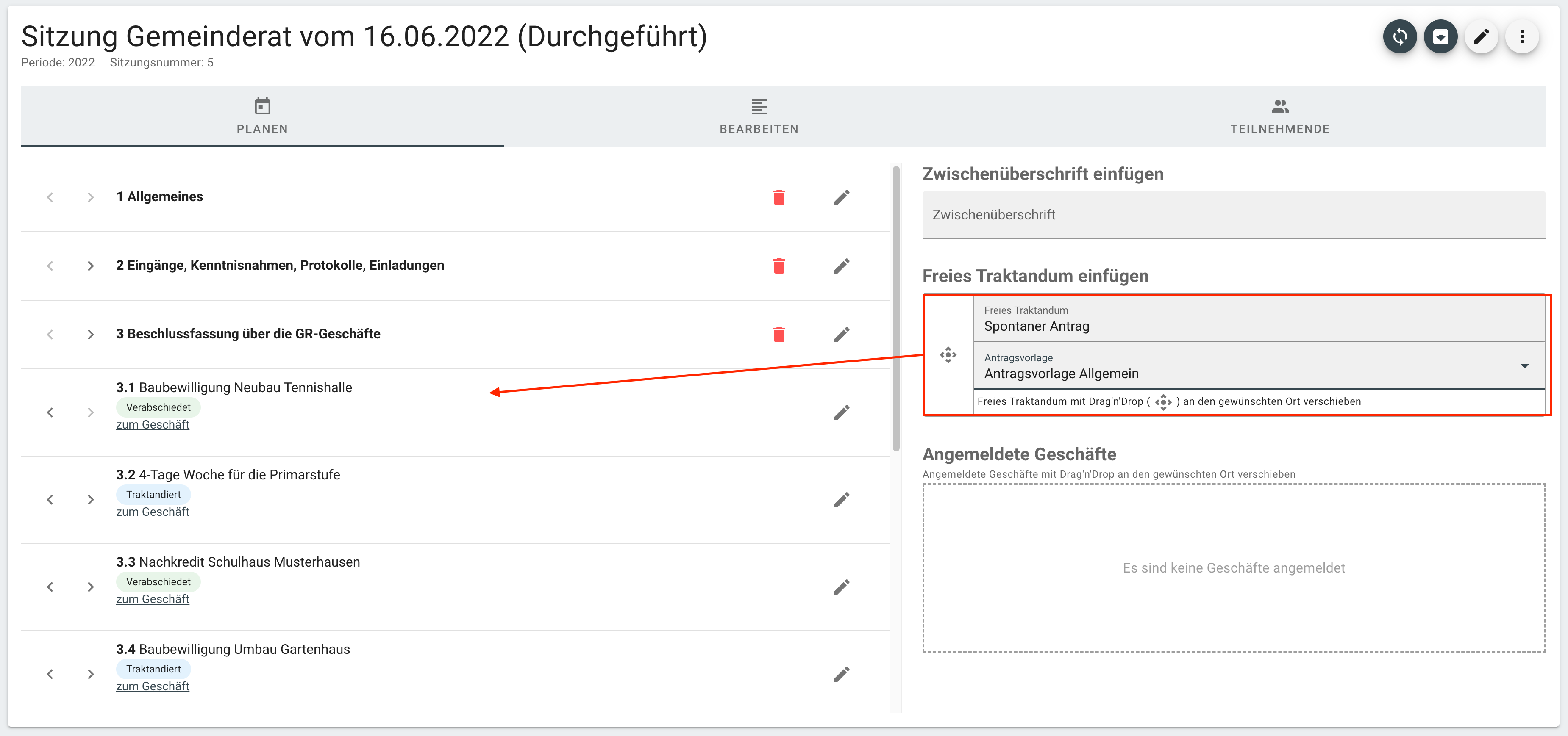 Anträge können mittels Drag and Drop zwischen den verschiedenen Überschriften hin- und her verschoben und am korrekten Ort in der Traktandenliste platziert werden.