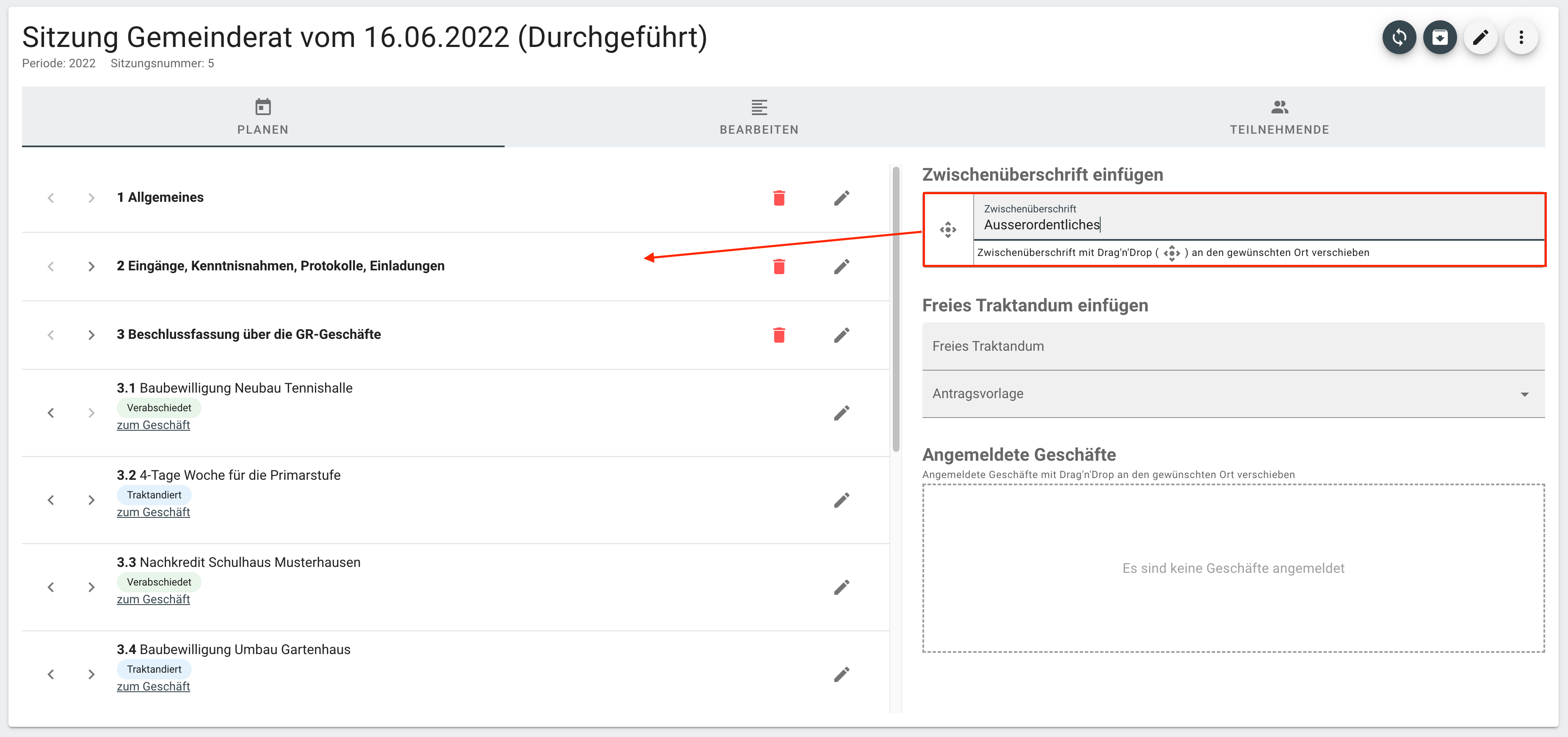 Falls die hinterlegte Sitzungsvorlage für eine spezifische Sitzung erweitert werden muss, können weitere Zwischenüberschriften per Drag and Drop hinzugefügt werden.