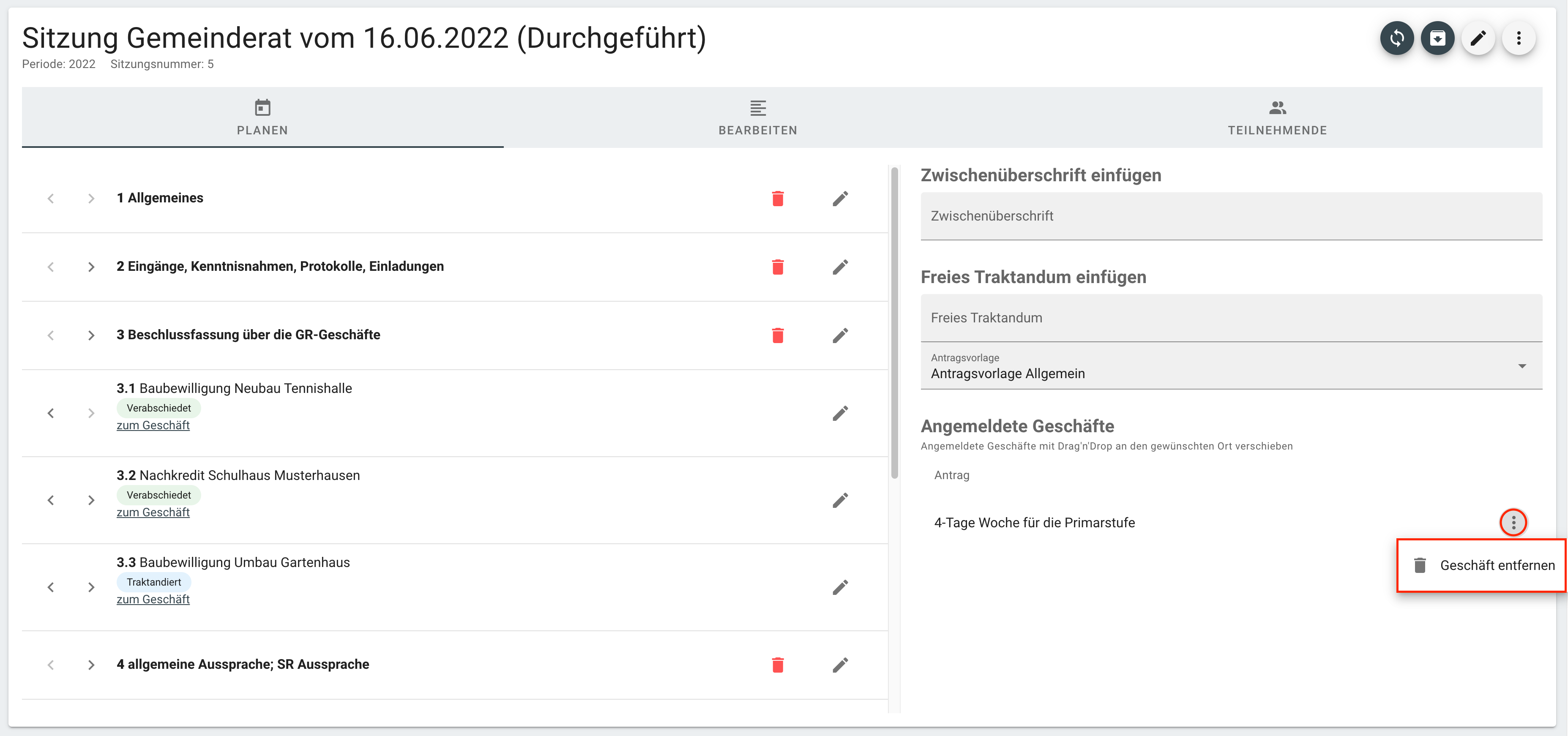Kurzfristige Anträge können direkt auf der Sitzung erstellt werden. Sogenannte Freie Traktanden können hinzugefügt werden, setzen allerdings eine Antragsvorlage voraus, damit ein entsprechender Protokollauszug für dieses Traktandum generiert werden kann.